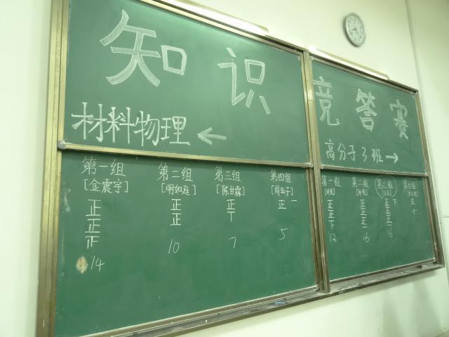比赛过程中,各个小组在组长的带领下,积极思考、热烈讨论并进行抢答,各小组组员之间十分团结,组与组之间的竞争十分激烈,整个比赛过程保持着良好的秩序。最后,由高分子材料三班班长王品带领的小组获得了此次比赛的冠军。