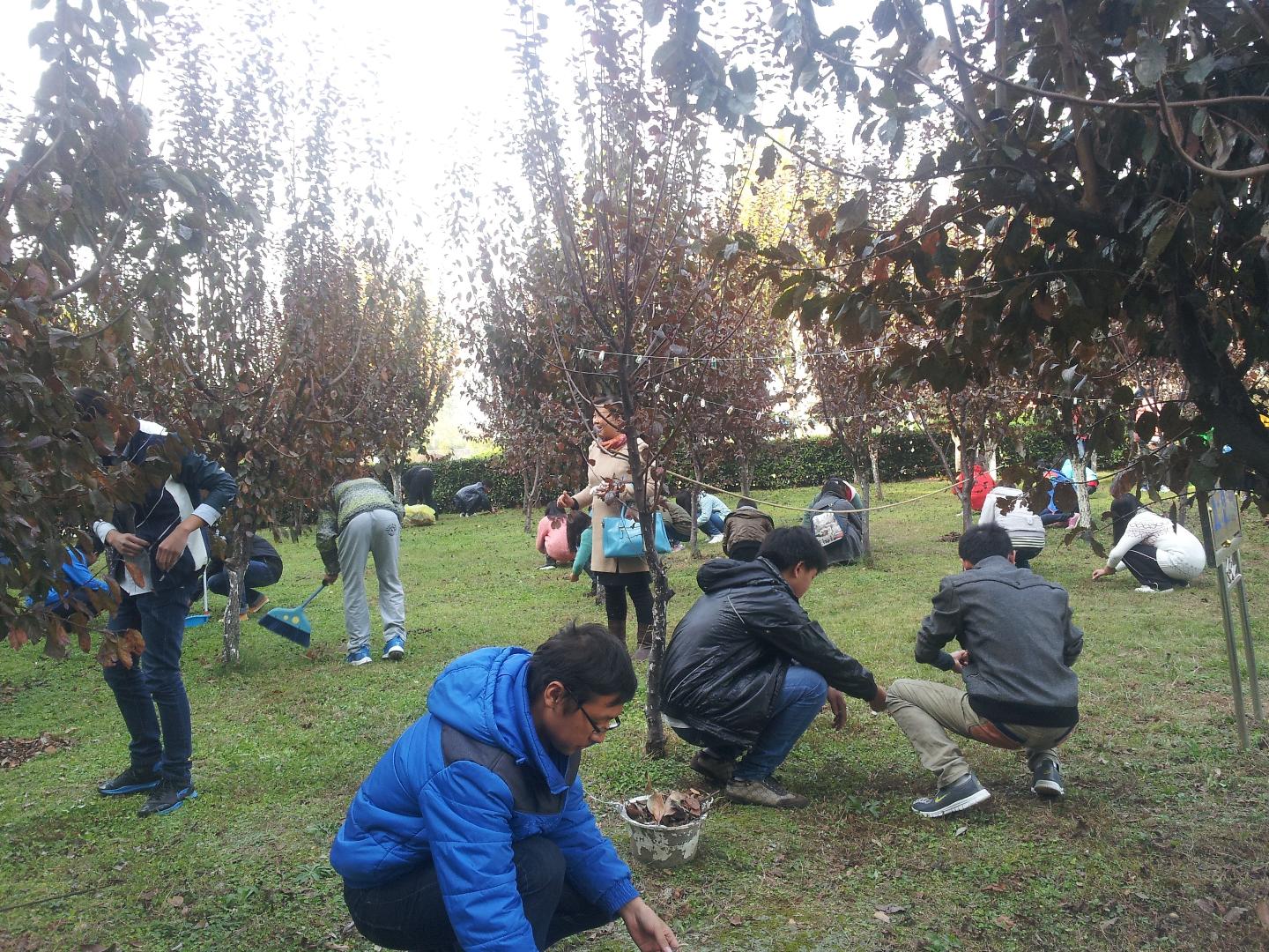 清理活动由正心苑员工会的生活部主办。同学们全部响应号召,于下午两点半准时到达,还主动向超市、寝室等地方借来扫帚簸箕,很快就热火朝天地干了起来。严老师也到了正心林,布置和了解了相关工作。同学们挽起衣袖,埋下头就捡起落叶、石子,互相帮助,笑意吟吟。由于一起工作的同学们众多,一人负责一小片区域的同时还有合理分工,秩序井然。整个正心林在约四十分钟以后就基本焕然一新。同学们看着干净整洁的正心林,满足而归。