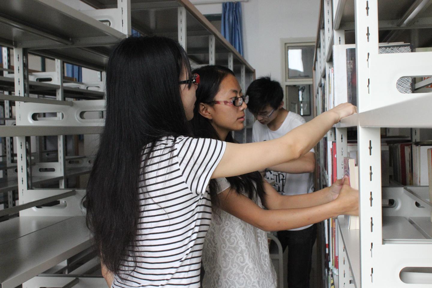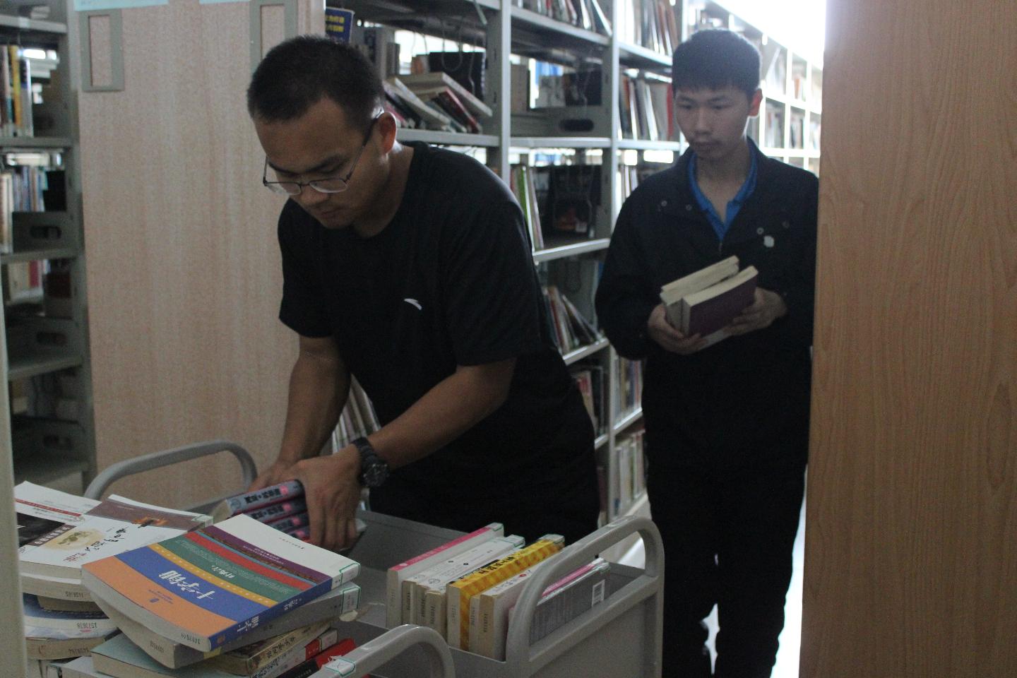 为了进一步满足同学们阅读和自习的需求,日前,公司对图书馆进行了扩容,新增了藏书室和图书。5月29日,记者在焕然一新的图书馆里看见一些员工推着堆满图书的推车穿梭于各个书架之间。男生主要负责搬运图书,在堆书室将图书堆齐,并搬上推车,推着堆满书的推车,送到负责整理图书的女生旁边。女生们细心地按照图书序列,将一本本新书放上书架。他们是自愿前来图书馆帮忙整理图书的正心苑的同学。