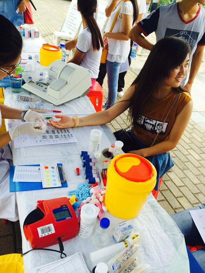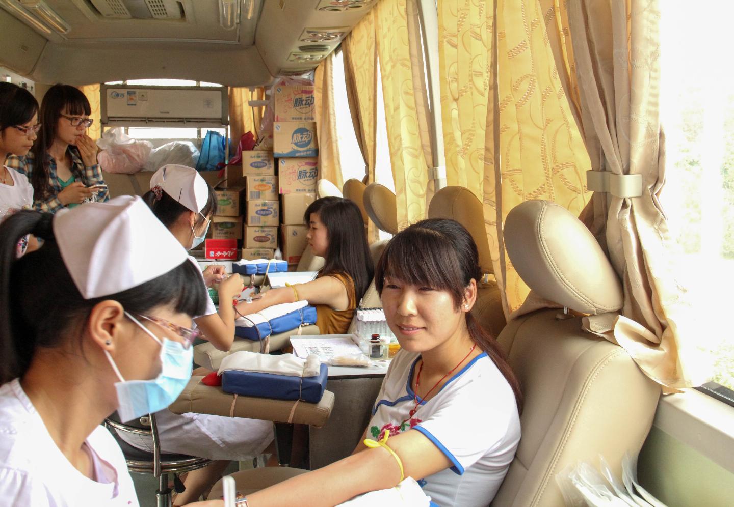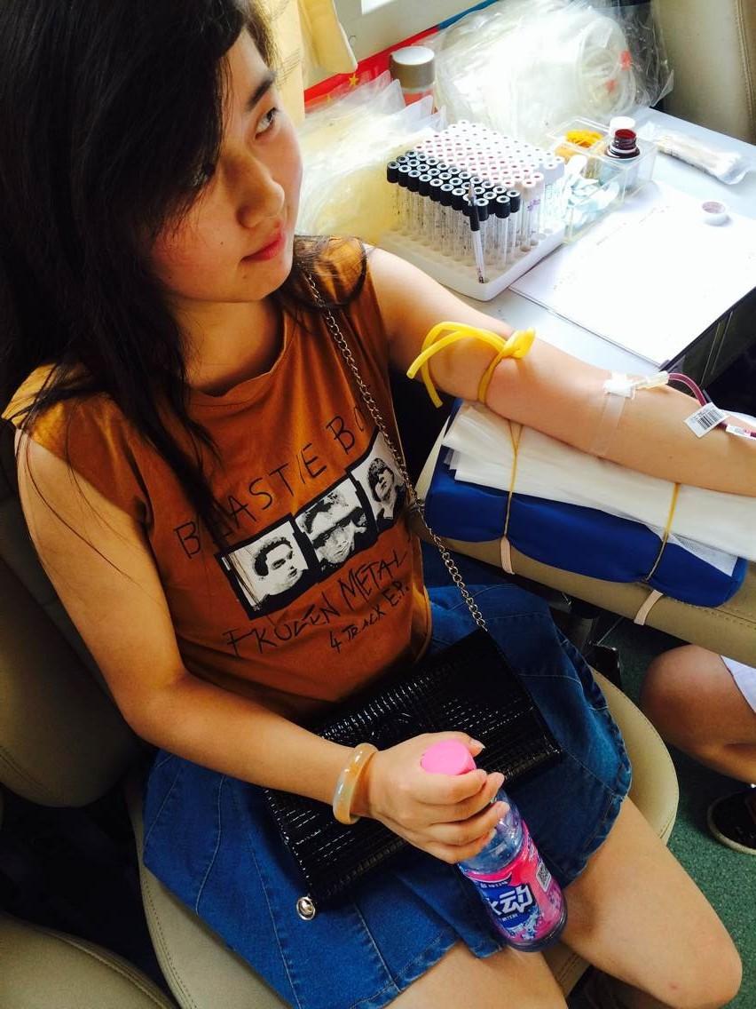 据了解,本次参加献血的员工大都是人生第一次献血。来自商公司的谭莉娟也不例外,她看起来瘦弱却俊秀的脸上透露出一丝激动。她并不像其他献血者一样坐下来喝水休息,反而和她的志愿者同学们一起帮助医务工作者做一些准备工作。当被问及这次献血的原因时,她回答说自己早就有献血的打算了,由于之前年龄未满十八周岁,只能陪妈妈一起去献血,此次能够亲身参与,她十分兴奋。经过血红蛋白含量、乙肝病毒、肝功能、血型四项检测之后,她作为今天第一个献血的“女汉子”勇敢地走上了献血车。一系列的鲜血准备工作后,粗大的献血针头扎入了她的手臂。整个献血过程进行的十分顺利,谭莉娟的气色状态也十分良好。献血后,谭回顾说,“其实刚开始还有些紧张害怕,但在医生的耐心疏导以及志愿者送饼干送水的热心呵护下,她很快调整好了心情,献血的过程也并没有想像的那么疼”。她调侃说,再献200毫升也没问题!这个内心充满阳光和爱心的女孩在捐献了300毫升血液之后开心又满足的继续她的志愿者工作了。她还说以后打算号召身边更多有爱心的同学、朋友们一起加入献血活动。