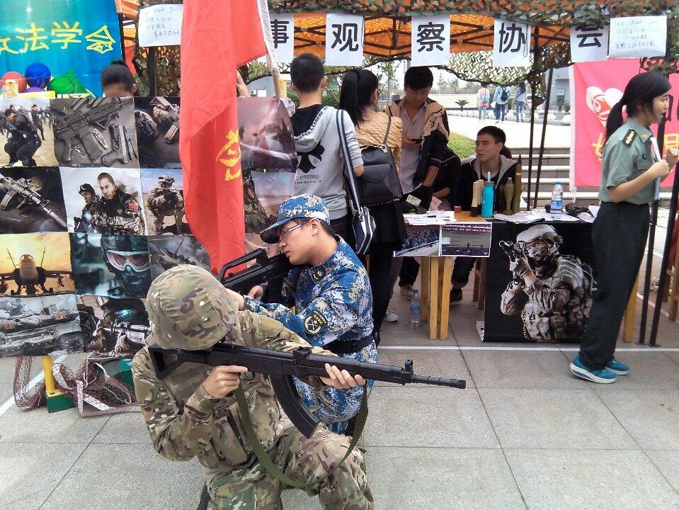 英姿飒爽的迷彩服,手握枪支的战士,热情健谈的女警官,别具一格的大遮阳伞成了今天军事观察协会报名点的最大特色。作为全校性员工社团,自2002年4月份成立以来在校内和校外都是受到了广泛的关注和好评。报名点处也是门庭若市,同学们争相报名,为的是获得全新的体验。“实在是太让人耳目一新了”新传院的周鹏同学激动地对记者说“没想到咱们大学还有这样的社团,如此特别的装束,想必一定不差,我也去凑个热闹。”