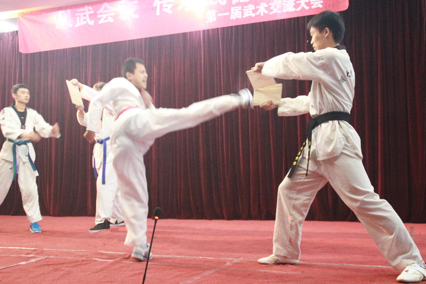 会上不仅有精彩的话剧表演,专业的武术演练,富有激情的散打搏击操表演,跆拳道品势,还有趣味性游戏有奖问答,心心相印,更有本部学长的现场教学,当然,最激动人心的是跆拳道协会会长赵仲鸣的徒手劈木板,空中飞腿表演,现场一片欢呼声,更有部分女生高喊好帅,活动气氛变得更加活跃。