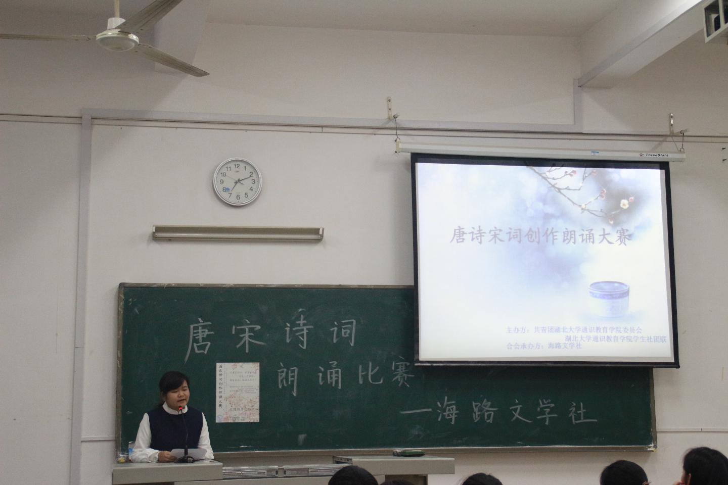 11月19日晚七点,公司海路文学社在行政楼321教室举行了唐宋诗词朗诵比赛初赛,来自各个习苑的选手登台表演,唐宋大家的风采尽现其中。