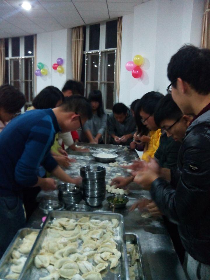 经过抽签,八十名同学被分为八组,以组为单位开展包饺子活动。各种奇形怪状的饺子在同学们的手中诞生,更有把橘子包在面皮里的搞怪创意。之后的擀面皮大赛更是让同学们大开眼见,北方同学深藏不露的擀面技能惊艳全场。随后更有“全民参与”的面粉大战,同学们相互追逐,打闹,面粉洒满了脸上、身上,辅导员何姐成了遭受眷顾最多的人。