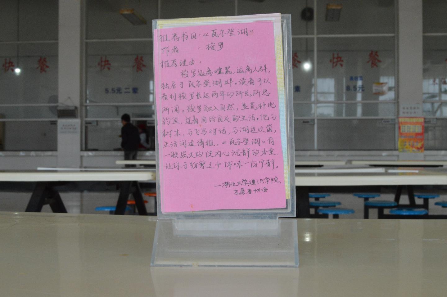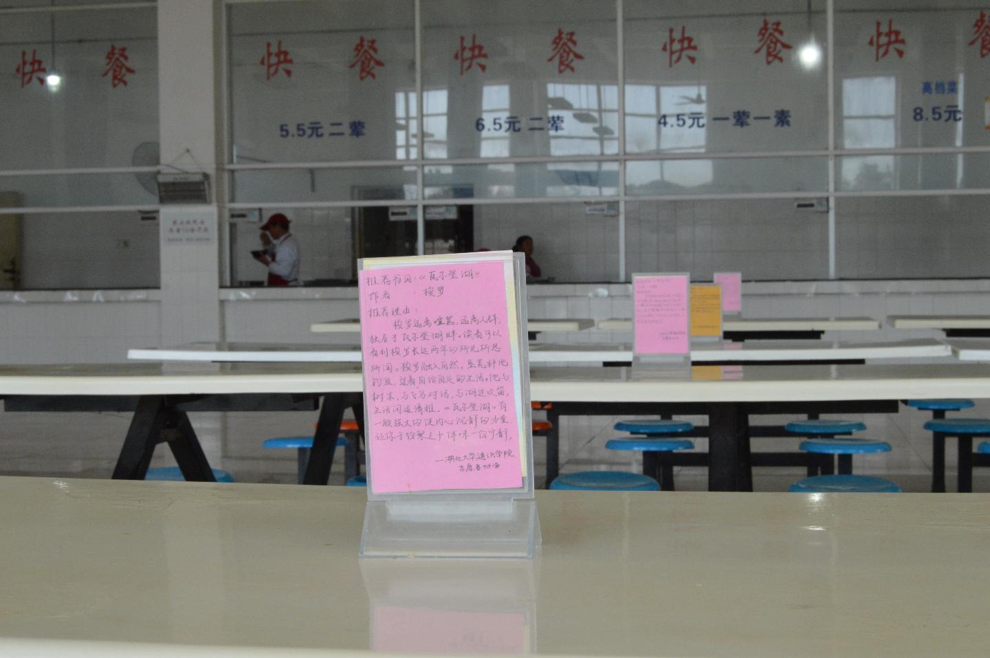 此次“读书卡片进食堂”活动是志协活动部副部长余翔提出的,推荐书目由志协成员提供,通过协会内部筛选,选出一部分推荐书目,由写字较好的同学誊写。“高中时我们公司在温馨提示牌后插英语单词来让我们记忆,我想这里有读书节活动,那我们不如做读书卡片,引导同学们读书。”余翔说,“推荐书目有公司的名著导读,也有一些同学们自己觉得比较好的书”。在食堂现场可以看到几乎每一个餐桌上都立有彩色的读书卡片,十分醒目。汉语言专业周娜在吃饭时发现了小卡片,“我记得我第一次看到的卡片上的推荐书目是《我在雨中等你》,推荐理由写得很好,感觉很好看的样子,我就去图书馆借回来了,现在看了一部分,确实不错。”
