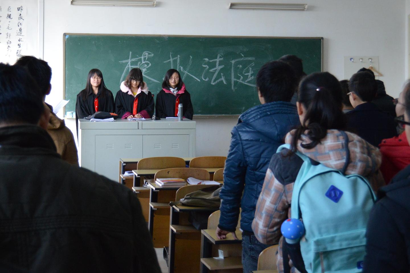 “请全体人员保持安静,现在正式开庭,请审判长、辩护人、公诉人入庭。”话音刚落,三名身着法袍的审判员和公诉人、辩护人走了进来。随后因抢劫杀人的四名“被告”也被法警押上了法庭。经过审判员对案件的介绍、被告人的自我介绍和公诉人对起诉书的宣读三个阶段,庭审进入法庭调查。