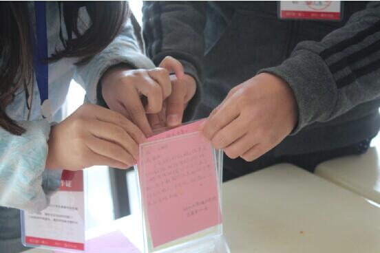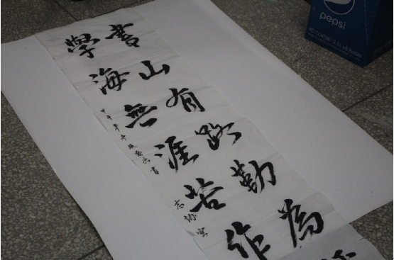 “书山有路勤为径,学海无涯苦作舟”当你在教室中看到这样一幅昂扬有力的书法作品,不知是否能够激发你努力上进的学习精神呢?紧接读书卡片进食堂的活动后,志愿者协会又与书法协会合作,整合数十张书法作品,在宣纸上写好,在卡纸上印好,在墙上贴好。