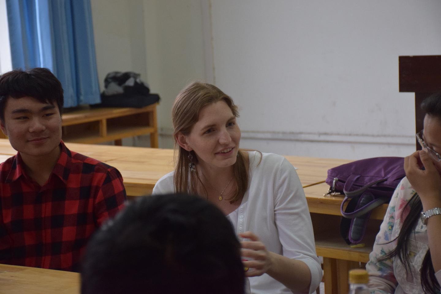 在宽敞的教室中央,六张桌子被拼成了长方形状,讲台上,英语广播台的工作人员播放着背景音乐,Kelly和员工就着六张桌子坐成一个圈。中国食物、武汉话、难忘的经历、音乐……这些都是Kelly和员工交流时的话题。“Can I speak Chinglish?(我能说中式英语吗) ”工程管理专业的张杨宝的话让外教及在座员工的嘴角上扬,“I open a shop……They are ‘zero food’!(我开了一家店,卖的是零食)”他的特有名词“zero food”再次触及了同学们的笑点。“对于今晚的英语角我有两个评价,一个是这个英语角办得很好,第二个是让我有玩英语的感觉,很开心,很长知识。比如现在我可以说,of course!”张杨宝说。