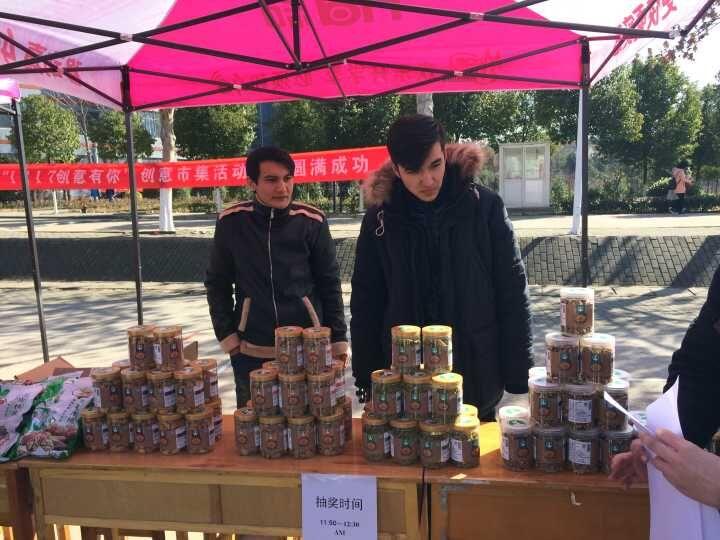 “新疆葡萄干,黑加仑果干,来看看!”去年创意市集的冠军,这个来自新疆的商公司工程管理专业大二的员工努尔夏提和他的兄弟们正在一边吆喝一边摆放商品。在桌子上摆放了黑加仑、核桃仁、葡萄干、开口杏仁、红枣等,摊位前还放着他们的宣传牌“丝路之果”。“我们公司在2015年11月创办,货是从新疆运来,在天津包装。”已经在本部卖了一年多的他们表示,这些果干没有卖不完的时候。“我想吃他们新疆的红枣啊,这个应该比较特别一些吧!”国际经济贸易+英语专业的岑杏芬手拿刚买到的新疆大红枣高兴地说道。努尔夏提表示在这次活动办完后想回本部向公司申请在湖大摆摊,参加各种活动,把他们的公司办大办得越来越好。