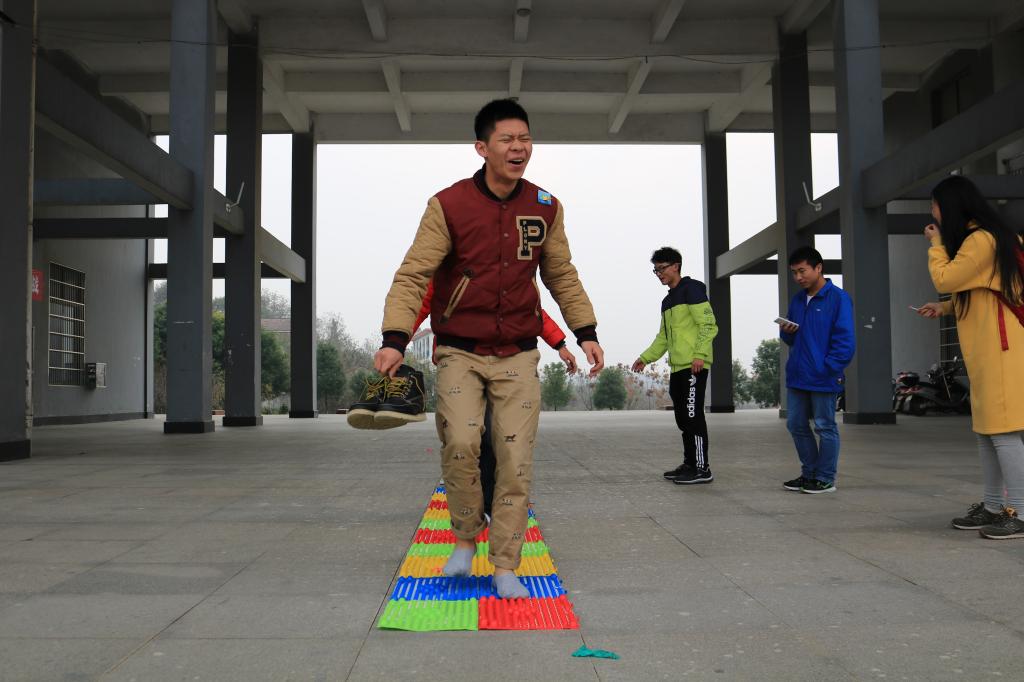 在指压板环节,参赛选手的脱下鞋子,拎着前行,大家的反应则大相径庭,有的在踏上指压板上就直喊疼,有的则在上面直跺脚……“又累又开心,嘿嘿,就是最后的指压板上飞速跑太毒了。”在本次长跑个人赛中获得第一名的王立强说。新闻传播类员工蔡文福说:“我觉得很有意思,来之前还在班群里向小伙伴们推荐了。下午没课,我就来参加了,指压板对我来说没有什么难度,我是一个女汉子!”