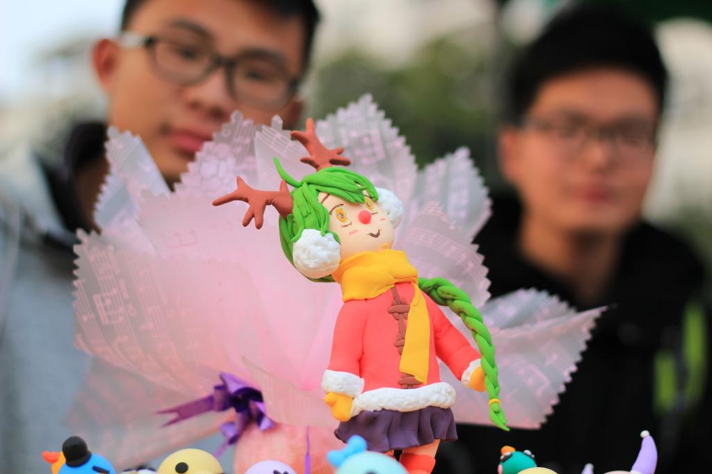 “湖小贝是用超轻黏土做成的。”2016级心理学专业员工王美晨介绍道,她是这个“私人定制”手工摊的摊主。“这个校园吉祥物就是一个同学订做的。”她们上午接到任务,订做的员工中午来看制作进程时,‘小贝’已经套上棉靴穿上红袄,就差个脑袋。“我为了做得更好,下午落下摊子潜在宿舍做,关了手机,花了3小时才最终完工。”她指着“湖小贝”说道,“结果手机被打爆了,她们太期待了。”她笑着说。