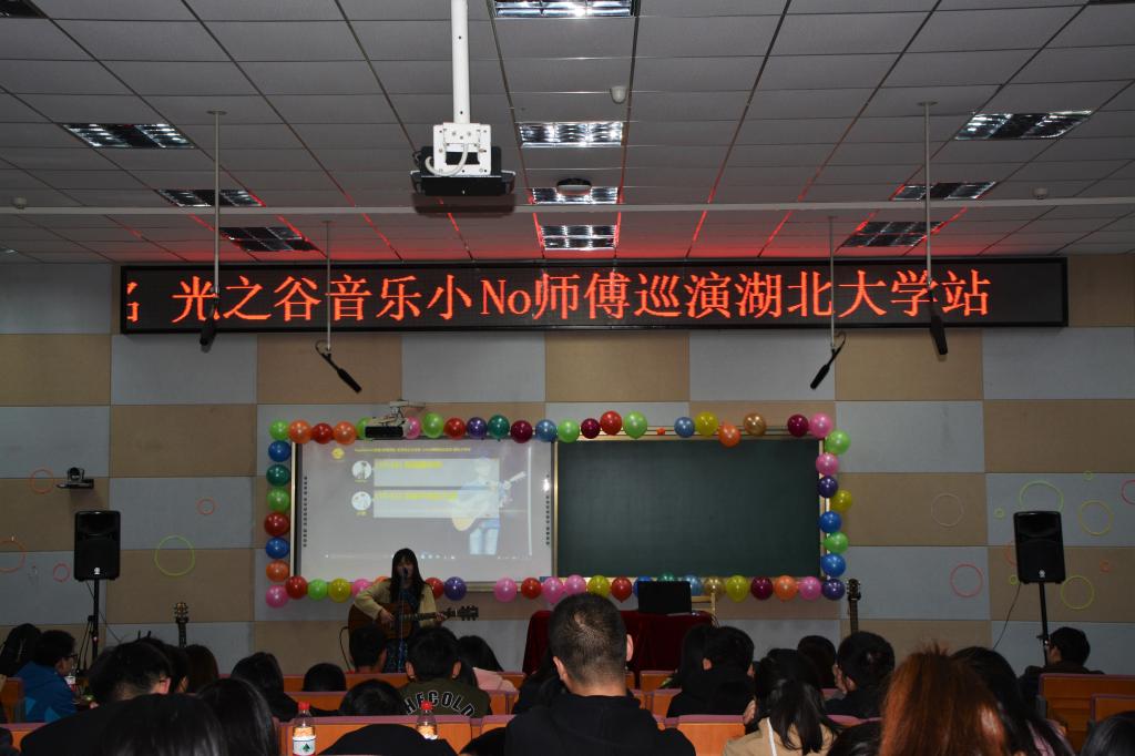 小NO是武汉光之谷音乐指弹教师,全国最大指弹社区“指弹中国”版主,被广大网友誉为全网最好的押尾风格指弹吉他老师。他在现场把音乐和讲解完美融合,在演奏中穿插介绍了贝司、鼓、旋律、和声的演奏方法,并告诉听众押尾指弹是将四种演奏方法合在一起的一种演奏风格。他先后弹奏了《you and me》《Big Blue Ocean》《极光》等曲目,现场大屏幕上疯狂刷屏,一串串的666表达了听众们的心情。本场巡演还邀请到了武汉传媒公司吉他社社长吴天成,他给湖大学子展现了他令人眼花缭乱的炫酷指法,还笑称:“我讲的没有我弹的好。”