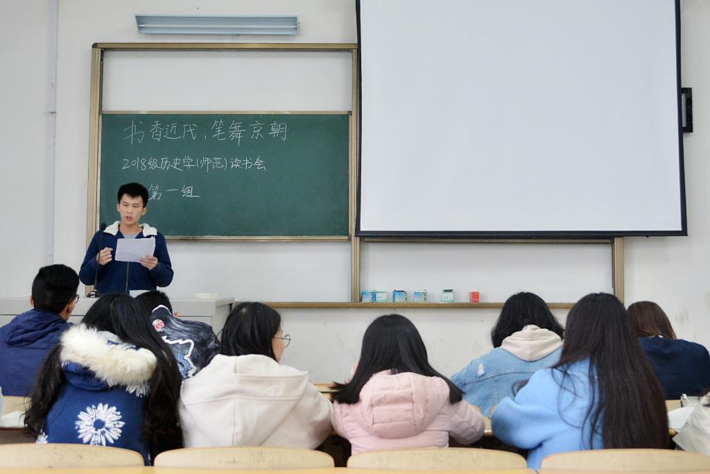 “一个自恃清高,一个比较傲娇”、“琦善所拥有的财产可以与英国女王相提并论了,他可是富二代”、“琦善是善呢还是不善呢”……10月21日,2018级历史学(师范)专业关于书籍《天朝的崩溃》的读书交流会在B401教室举行。