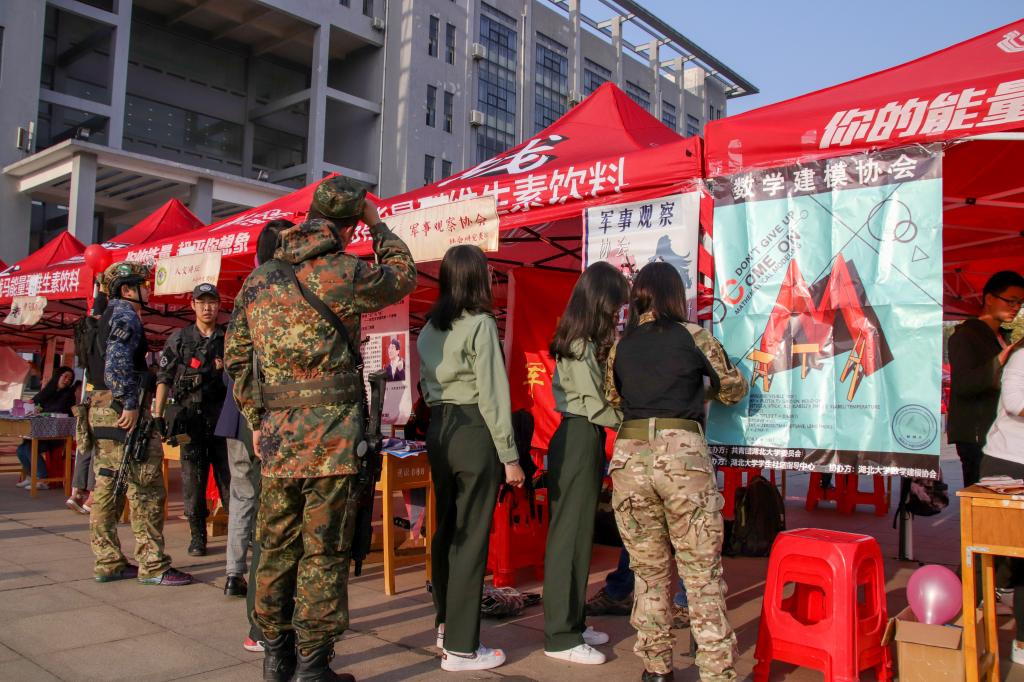 FD动漫社面前聚集了不少的员工前来观看,社团形式丰富多彩,有ACGN,WOTA艺,cosplay,宅舞等活动,cosplay魔道祖师莫玄羽,武装jk和军事观察协会的联合展示,军事观察协会的成员身穿迷彩服或军装,吸引了很多大一新生主动前来了解,并有小礼物的赠送,让许多员工们感受到了动漫的新奇和乐趣。而武装jk则是将动漫和军事这两种元素结合起来,让许多员工们不仅感受到动漫的新奇和乐趣,还过了一把军事瘾。2019级计算机专业李冠华说:“军事观察协会设置了我很感兴趣的’真人cs’项目,我会借此丰富自己的课余生活。”