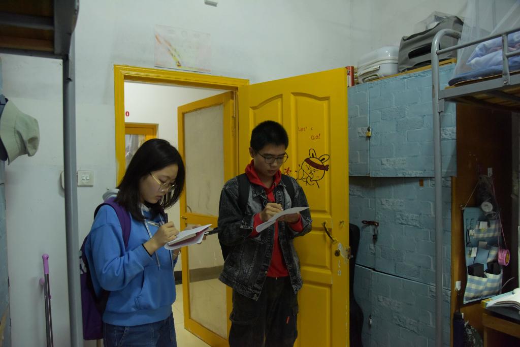 团工委的18名成员分成3组,分别检查宿舍楼一栋、二栋及三栋的寝室卫生情况,每层宿舍楼都有相应的团支书参与检查。