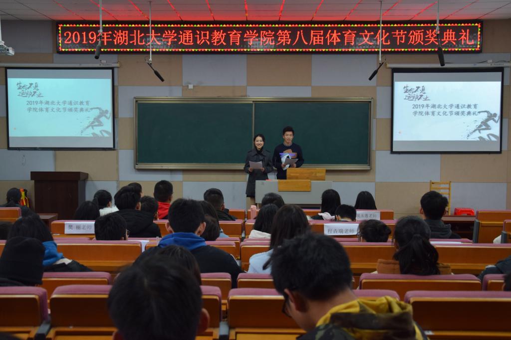 颁奖典礼伊始,师生通过视频回忆了体育文化节各个项目的精彩瞬间。辅导员马骁俊说,此次举办体育文化节,旨在鼓励员工们走出寝室,走进操场,不做葛优瘫,不当键盘侠。他提倡员工们多进行体育运动,这样才能拥有健康的体魄。辅导员徐迅表示,举办此次活动的目的是想以一小部分热爱运动的人带动一大部分人,吸引更多的通识学子热爱运动、坚持运动。他也很欣慰:“随着体育文化节的开展,我看到了很多员工开始主动地运动。”