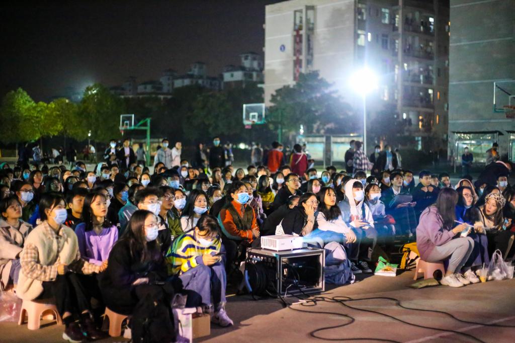 距影片播放还有半个小时的时间,就有不少同学搬着小板凳坐到前排,想要“抢占先机”。影片时长长达158分钟,中途没有一位同学提前离开,有的凝神细看,有的和身边的同学小声交流着剧情,还有不少员工陆陆续续从宿舍、教学楼赶来观看电影。电影正片结束后,2020级哲学专业的陈国渝在原地驻留许久,他说到:“这是我第一次观看露天电影,原子弹爆炸的情节让我很有感触,男主与女主的无法相认的痛苦,让我感到非常难受和遗憾。”2020级金融学专业的朱丽琴更是感慨,自己时隔上十年再看露天电影,还是《我和我的祖国》这样的影片,有一种热泪盈眶的感觉。